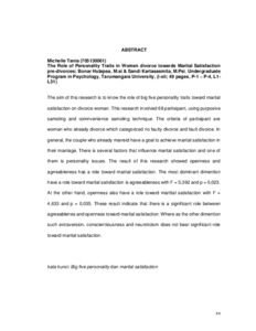 The aim of this research is to know the role of big five personality traits toward marital satisfaction on divorce woman. This research involved 68 partisipant, using purposive samoling and comnvenience samoling technique. The criteria of partisipant are woman who already divorce which categorized no faulty divorce and fault divorce. In general, the couple who already marreid have a goal to achieve marital satisfaction in their marriage. There is several factors that influence marital satisfaction and one of them is personality issues. The result of this research showed openness and agrreableness has a role toward marital satisfaction. The most dominant dimention have a role toward marital satisfaction is agreeableness with F = 5,392 and p = 0,023. At the other hand, openness also have a role toward martital satisfaction with F = 4,633 and p = 0,035. These result indicate that there is a significant role between agreeablenes and openness toward marital satisfaction. Where as the other dimention such extraversion, conscientiousness and neuroticism does not bear significant role toward marital satisfaction.