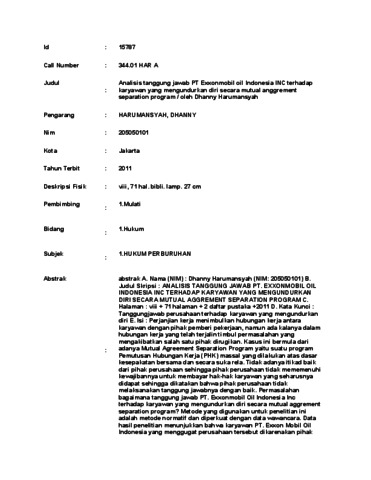 DHANNY, HARUMANSYAH (2011) Analisis tanggung jawab PT Exxonmobil oil Indonesia INC terhadap karyawan yang mengundurkan diri secara mutual anggrement separation program / oleh Dhanny Harumansyah. Skripsi thesis, UNIVERSITAS TARUMANAGARA.