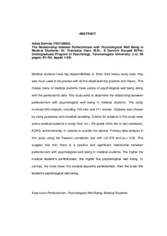 Dwinita, Adela (2017) Hubungan antara perfeksionisme dengan psychological well being pada mahasiswa kedokteran. Skripsi thesis, Universitas Tarumanagara.