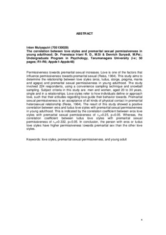 cinta (Reiss, 1964). Penelitian ini bertujuan untuk menguji hubungan tipe cinta (eros, ludus, storge, pragma, mania dan agape) dengan premarital sexual permissiveness pada dewasa muda. Penelitian ini melibatkan 224 responden, menggunakan teknik convenience sampling dan snowball sampling. Kriteria subyek dalam penelitian ini adalah: pria dan wanita, berusia 20 sampai 30 tahun, belum menikah dan memiliki pasangan heteroseksual. Tipe cinta merupakan cara seseorang mendefinisikan cinta, seperti sikap mereka mengenai cinta yang dapat menuntun perilaku mereka ke depan. Premarital sexual permissiveness adalah penerimaan keintiman fisik dalam hubungan heteroseksual pranikah (Reiss, 1964). Hasil penelitian menunjukkan adanya hubungan positif signifikan antara tipe cinta eros dan ludus dengan premarital sexual permissiveness pada dewasa muda. Hal ini ditunjukkan dengan rxy=0.25, p<0.05. Sedangkan tipe cinta ludus dengan premarital sexual permissiveness ditunjukkan dengan rxy=0.332, p<0.05. Berarti, individu dengan tipe cinta eros atau ludus memiliki sikap permisif terhadap perilaku seks pranikah."