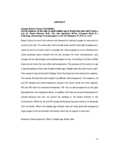 Batak Culture is one of the cultures that demand for married couples to have sons to continue the clan. For wives who can’t provide boys need to have self-acceptance in order for them to function well in everyday life. Self-acceptance is an individual who views positively about himself and his life, accepts his inner characteristics, and accepts all the adventages and disadventages he has. According to Hurlock (2006) there are ten factor that can affect self-acceptance. The purpose of this study is to get a self-acceptance of the wife of adult middle age in Batak tribe who don’t have a son. This research was conducted in Balige, North Sumatera by interviewing four subjects. The results showed that each subject has different self-acceptance. Two subjects, JS and RP already have self-acceptance overall of ten factor, while the other subjects, RS dan MS have not received themselves. RS has no self-acceptance as she gets demands from her husband’s family. In addition, MS has not received themselves in overall because she can not control her feelings in the faceof criticism in the environment. While the JS and RP accept themselves because there is no demands from the family. Wife in the middle age of Batak tribe can have good self-acceptance if get support from environment and family which do not require to have son.