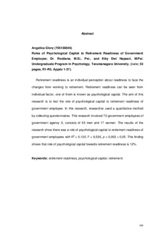 individual factor, one of them is known as psychological capital. The aim of this research is to test the role of psychological capital to retirement readiness of government employee. In this research, researcher used a quantitative method by collecting questionnaires. This research involved 72 government employees of