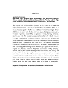 Faustine, Clarinta (2017) Studi deskriptif persepsi living values pada perempuan dewasa akhir dari etnis Tionghoa peranakan. Skripsi thesis, Universitas Tarumanagara.