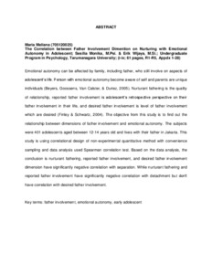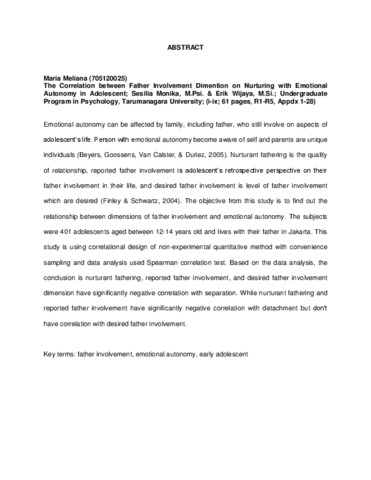 Emotional autonomy can be affected by family, including father, who still involve on aspects of adolescent’s life. Person with emotional autonomy become aware of self and parents are unique individuals (Beyers, Goossens, Van Calster, & Duriez, 2005). Nurturant fathering is the quality of relationship, reported father involvement is adolescent’s retrospective perspective on their father involvement in their life, and desired father involvement is level of father involvement which are desired (Finley & Schwartz, 2004). The objective from this study is to find out the relationship between dimensions of father involvement and emotional autonomy. The subjects were 401 adolescents aged between 12-14 years old and lives with their father in Jakarta. This study is using correlational design of non-experimental quantitative method with convenience sampling and data analysis used Spearman correlation test. Based on the data analysis, the conclusion is nurturant fathering, reported father involvement, and desired father involvement dimension have significantly negative correlation with separation. While nurturant fathering and reported father involvement have significantly negative correlation with detachment but don’t have correlation with desired father involvement.