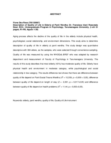 Dea Rosa, Fiona (2016) Gambaran kualitas hidup pada lanjut usia yang tinggal di Panti Werdha. Skripsi thesis, Universitas Tarumanagara.