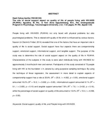 Cahya Aprilia, Hasti (2016) Peranan aspek dukungan sosial terhadap kualitas hidup pada orang dengan HIV/AIDS (ODHA). Skripsi thesis, Universitas Tarumanagara.