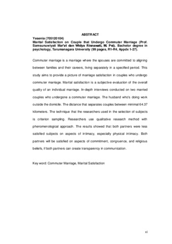 Yesenia, Yesenia (2016) Gambaran kepuasan pernikahan pada pasangan suami istri yang menjalani commuter marriage. Skripsi thesis, Universitas Tarumanagara.