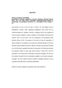 Drug abuse not only in men but also in women. For drug addicts need a rehabilitation, however while undergoing rehabilitation often faced with the emotional problem on residence. Emotion in residence tend to be unstable and need of emotion regulation. Emotion regulation is the process of forming one’s emotion, when one has them, how one experiences, and expresses these emotions (Gross, 2014). The purpose of this study is to get the description of woman residence. The analysis on this study were assessed based on the theory Garnefsi, Kraiij, and Spinhoven (2001). Based on research conducted by Choopan et al., (2016) emotion regulation take effect on drug abuse. On this study conducted by qualitative method of case study within February to May 2017, with five participants. This study uses the technique of purposive sampling. The result of this research showed that five of participants capable to use emotion regulation strategies. The most cognitive emotion regulation strategies frequently use are acceptance, blaming others, and positive reappraisal.