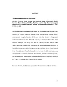 Altruism is a desire to benefit someone else for his or her sake rather than one’s own (Batson, 2011). Form of altruism analized in this study is related to blood donors, accordance to study by Kasraian (2010), who state that altruism is the greatest motivation on blood donation. This study was using qualitative method with in-depth interview technique. Data taking were done on February until April 2017 on D.K.I Jakarta with three subjects aged 40-60 years old who received Medal of Honors in Social Services as appreciation from goverment given to blood donors after a hundred times of blood donation. Result of the study show that each blood donors has a variety concept of altruism consider to altruism characteristics, altruism theoretical approach, and altruism factors. This study also found that the more altruism theoretical approach one’s have, the more altruism characteristic he possess.