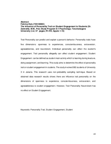 Trait Personality can predict and explain a person's behavior. Personality traits have five dimensions: openness to experiences, conscientiousness, extraversion, agreeablennes, and neuroticism. Individual personality can affect the student's engagement. Trait personality allegedly can affect student engagement. Student Engagement can be defined as student main activity which is learning during leacture, doing assignment, and learning. This study aims to determine the effect of personality trait on student engagement in students. The study involved 382 students of University X in Jakarta. This research uses non-probability sampling technique. Based on obtained data research results shows there are influence trait personality on the dimensions of openness to experience, conscientiousness, extraversion, and agreeableness to student engagement. However, Trait Personality Neuroticism has no effect on Student Engagement.
