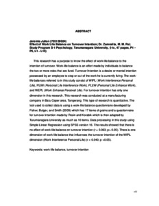 This research has a purpose to know the effect of work-life balance to the intention of turnover. Work-life balance is an effort made by individuals to balance the two or more roles that are lived. Turnover Intention is a desire or mental intention possessed by an employee to stop or out of the work he is currently living. The work-life balances referred to in this study consist of WIPL (Work Interference Personal Life), PLIW (Personal Life Interference Work), PLEW (Personal Life Enhance Work), and WEPL (Work Enhance Personal Life). For turnover intention has only one dimension in this research. This research was conducted at a manufacturing company in Batu Ceper area, Tangerang. This type of research is quantitative. The tool used to collect data is using a work-life balance questionnaire developed by Fisher, Bulger, and Smith (2009) which has 17 items of grains and a questionnaire for turnover intention made by Rosin and Korabik which is then adapted by Tarumanagara University as much as 10 items. Data processing in this study using Simple Linear Regression using SPSS version 16. The results showed that there is no effect of work-life balance on turnover intention (r = 0.063; p> 0.05). There is one dimension of work-life balance that influences the turnover intention of the WIPL dimension (Work Interference Personal Life) (r = 0.040; p <0.05).