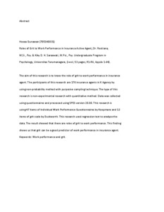 items of grit scale by Duckworth. This research used regression test to analyze the data. The result showed that there are roles of grit to work performance. This finding shows us that grit can be a good predictor of work performance in insurance agent."