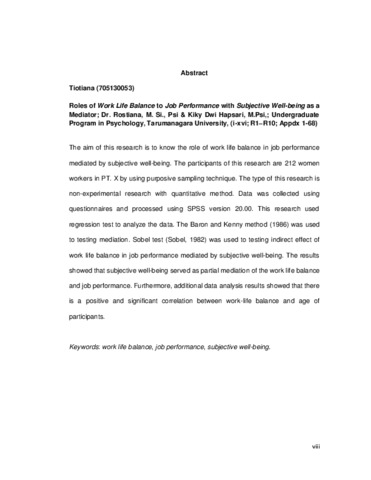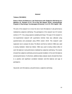 Tiotiana, Tiotiana (2017) Peran Keseimbangan Kerja-Kehidupan Terhadap Kinerja Dengan Subjective Well-Being Sebagai Mediator. Skripsi thesis, Universitas Tarumanagara.