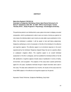 The performer pianist is an individual who uses a piano instrument to display a musical composition, which is professional in order to earn an income. Activity as a pianist not only makes the individual able to earn income, but also able to give satisfaction to him. When the individual is satisfied, it will be easier to feel well being subjectively. Subjective well being is a form of evaluation of the life of the individual in the affective and cognitive aspects. The affective aspect is an emotional response to the event experienced by the individual. Response shaped things that are fun (positive affect) or unpleasant (negative affect). The cognitive aspect is an overall individual assessment of the life it undergoes, and how satisfied the individual will be of his life (life satisfaction). Cognitive aspects include areas of satisfaction in terms of family, environment, and occupation. The subjects of this study were 3 pianist performers aged 25 to 35 years. Qualitative methods through in-depth interviews were used in this study. The data were collected for four months, the results of this study were the three SWB subjects in the affective and cognitive aspects as the pianist.