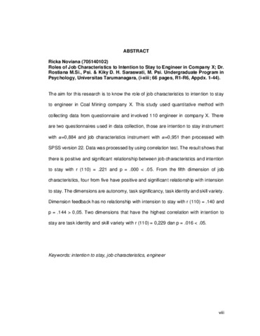 The aim for this research is to know the role of job characteristics to intention to stay to engineer in Coal Mining company X. This study used quantitative method with collecting data from questionnaire and involved 110 engineer in company X. There are two questionnaires used in data collection, those are intention to stay instrument with α=0,884 and job characteristics instrument with α=0,951 then processed with SPSS version 22. Data was processed by using correlation test. The result shows that there is positive and significant relationship between job characteristics and intention to stay with r (110) = .221 and p = .000 < .05. From the fifth dimension of job characteristics, four from five have positive and significant relationship with intension to stay. The dimensions are autonomy, task significancy, task identity and skill variety. Dimension feedback has no relationship with intension to stay with r (110) = .140 and p = .144 > 0,05. Two dimensions that have the highest correlation with intention to stay are task identity and skill variety with r (110) = 0,229 dan p = .016 < .05.