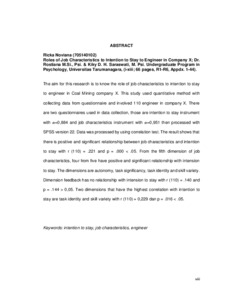 N., Ricka (2018) Peran Karakteristik Pekerjaan terhadap Intensi untuk Menetap pada Engineer di Perusahaan X. Skripsi thesis, Universitas Tarumanagara.