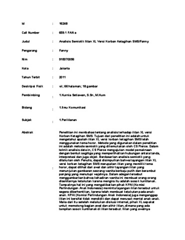 Fanny, Fanny (2011) Analisis Semiotik Iklan XL Versi Korban Ketagihan SMS/Fanny. Skripsi thesis, UNIVERSITAS TARUMANAGARA.