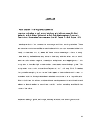 Nugraha, Ketut Septian Teddy (2018) Gambaran Motivasi Belajar pada Siswa SMA yang Tidak Naik Kelas. Skripsi thesis, Universitas Tarumanagara.