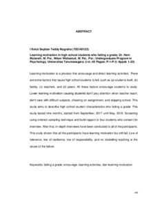 Learning motivation is a process that encourage and direct learning activities. There are some factors that cause high school students to fail, such as (a) students itself, (b) family, (c) teachers, and (d) peers. All these factors encourage students to study. Lower learning motivation causing students don’t pay attention when teacher teach, don’t care with difficult subjects, cheating on assigntment, and skipping school. This study aims to describe high school student characteristics who failing a grade. This study lasted nine months, started from September, 2017 until May, 2018. Screening using criterion sampling technique and build rapport to four students who consent for interview. After that, in-depth interviews have been conducted to all of the participants. This study shown that all the participants have learning motivation but still fail. Low of tolerance, low of resilience, low of responsibility, and no modelling teaching is the cause of the failure.