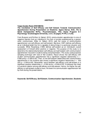 A’yun, Tasya Qurrata (2018) Hubungan Self-Efficacy dan Self-Esteem dengan Kecemasan Komunikasi dalam Melakukan Presentasi pada Mahasiswa. Skripsi thesis, Universitas Tarumanagara.