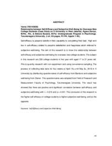 Self-efficacy is people’s beliefs in their capability to completing their task. High and low in self-efficacy related to people’s satisfaction and happiness which referred to subjective well-being. The aim of this research is to know the relationship between self-efficacy and subjective well-being for overseas new college students. The subject in this research are 228 college students in first year with aged 17 to 21 years old. This is quantity research with non-experiment and using convenience sampling. The process of collecting data lasts for four weeks at April 16th until May 8th, 2018 in X University by distributing questionnaires of self-efficacy from Bandura and subjective well-being from Diener. This questionnaires was adopted from Field of Research and Measurement Faculty of Psychology, Tarumanagara University. The result has showed that there are positive and significant correlation between self-efficacy and subjective well-being with r = 0.219 and p = 0.001. The conclusion of this research is the higher self-efficacy on college students is higher subjective well-being, and so the opposite.