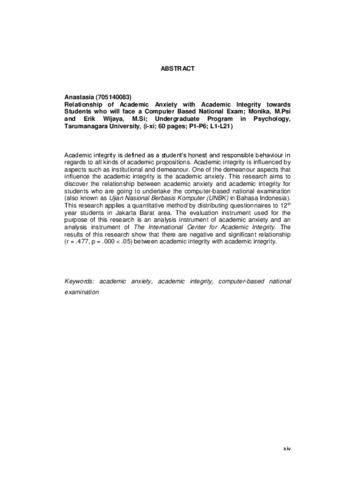 Anastasia, Anastasia (2018) Hubungan Kecemasan Akademik dengan Integritas Akademik pada Siswa yang akan Menghadapi Ujian Nasional Berbasis Komputer (UNBK). Skripsi thesis, Universitas Tarumanagara.
