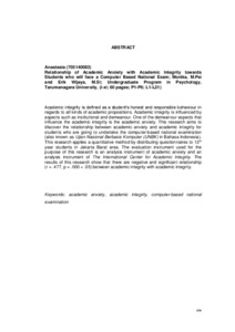 "Academic integrity is defined as a student’s honest and responsible behaviour in regards to all kinds of academic propositions. Academic integrity is influenced by aspects such as institutional and demeanour. One of the demeanour aspects that influence the academic integrity is the academic anxiety. This research aims to