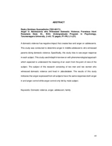 "A domestic violence has negative impact that creates fear and anger on adolescents. This study was conducted to determine anger in middle adolescents who witnessed parents doing domestic violence. Specifically, this study tries to see anger response in each subject. This study used indepth interview on with