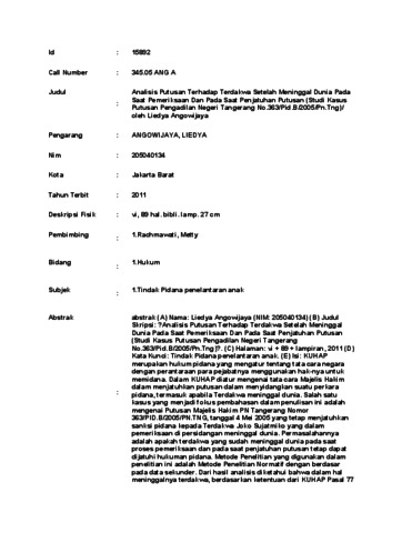 LIEDYA, ANGOWIJAYA (2011) Analisis Putusan Terhadap Terdakwa Setelah Meninggal Dunia Pada Saat Pemeriksaan Dan Pada Saat Penjatuhan Putusan (Studi Kasus Putusan Pengadilan Negeri Tangerang No.363/Pid.B/2005/Pn.Tng)/ oleh Liedya Angowijaya. Skripsi thesis, UNIVERSITAS TARUMANAGARA.