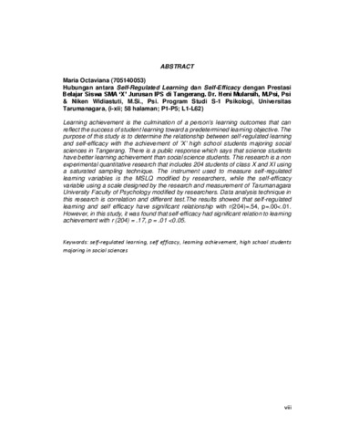 Octaviana, Maria (2018) Hubungan antara Self-Regulated Learning dan Self-Efficacy dengan Prestasi Belajar Siswa SMA ‘X’ Jurusan IPS di Tangerang. Skripsi thesis, Universitas Tarumanagara.