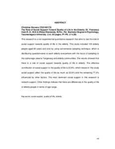elderly people aged 60 years and over by using convenience sampling technique, which is distributing questionnaires to each elderly everywhere with the focus of sampling to the orphanage Jakarta-Tangerang and elderly communities. The results showed that there is a role of social support towards quality of life in elderly.