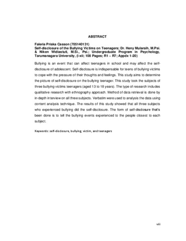 Casson, Faleria Priska (2018) Gambaran Self-Disclosure pada Remaja Korban Bullying. Skripsi thesis, Universitas Tarumanagara.