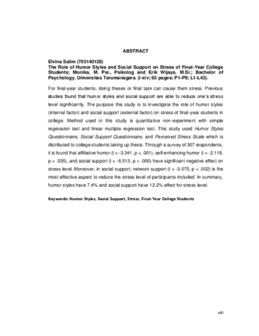 one’s stress level significantly. The purpose this study is to investigate the role of humor styles (internal factor) and social support (external factor) on stress of final-year students in college. Method used in this study is quantitative nonexperiment with simple regression test and linear multiple regression test. This study used Humor Styles Questionnaire, Social Support Questionnaire, and Perceived Stress Scale which is distributed to college students taking up thesis. Through a survey of 307 respondents, it is found that affiliative humor (t = -3.341, p <. 001), self-enhancing humor (t = -2.118, p < .035), and social support (t = - 6.513, p < .000) have significant negative effect on stress level. Moreover, in social support, network support (t = -3.075, p < .002) is the most effective aspect to reduce the stress level of participants included. In summary, humor styles have 7.4% and social support have 12.2% effect for stress level."