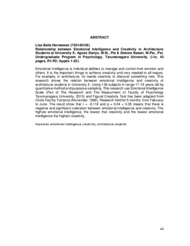 majors. For example, in architecture, its needs creativity to discover something new. This research shows the relation between emotional intelligence and creativity of architecture students in University X. Using 136 subjects in range 17- 19 years old by quantitative method and purposive sampling. This research use Emotional Intelligence Scale (Part of The Research and The Measurment of Faculty of Psychology Tarumanagara University, 2013) and Figural Creativity Test has been adapted from Circle Test by Torrance (Munandar, 1998). Research held for 5 months, from February to June. The result show that r = -0,118 and p = 0.04 < 0.05 means that there is negative and significant coleration between emotional intelligence and creativity. The highest emotional intelligence, the lowest that creativity and the lowest emotional intelligence the highest creativity."