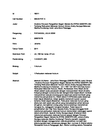 JULIA DEWI, PATANGGU (2011) Analisis Putusan Pengadilan Negeri Makale No.57/Pdt.G/2007/Pn.Mkl Tentang Perbuatan Melawan Hukum Antara Andry Nurjaya Melawan Martha Kombong / oleh Julia Dewi Patanggu. Skripsi thesis, UNIVERSITAS TARUMANAGARA.