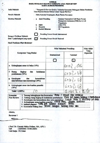 Hetty Karunia Tunjungsari, Reviewer and Ryan Paulus Suryajaya, Reviewer (2012) Review B18. Hetty Karunia Tunjungsari, Ryan Paulus Suryajaya. Review. " Pengaruh E-Service Quality Terhadap Kepuasan Pelanggan Dalam Pembelian Tiket Pesawat Secara Online Untuk Tujuan Berlibur ". ISSN 2302-7770