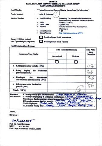 Lerbin R. Aritonang, review (2015) Reviewer Prosiding B23, Lerbin R. Aritonang. ” Testing Richins And Dawson Material Values Scale For Indonesians “ (23). pp. 1-25. ISSN 978-602-14716-2-3