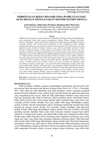 Santoso, Gatot and Permana, Muki Satya and Purwanto, Bambang Heru (2018) PERHITUNGAN BEBAN DINAMIK PADA PEMBUATAN PAKU KUDA DENGAN MENGGUNAKAN METODE ELEMEN HINGGA. In: Prosiding Seminar Nasional Mesin dan Industri (SNMI ) XII 2018. Universitas Tarumanagara, pp. 49-54. ISBN 978-602-71459-9-3