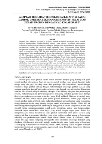 Darmawan, Steven and Utama, Didi Widya and Tanujaya, Harto (2018) ADAPTASI TERHADAP TEKNOLOGI APLIKATIF SEBAGAI DAMPAK DARI ERA TEKNOLOGI DISRUPTIF: PELATIHAN DESAIN PRODUK DENGAN CAD KOLABORATIF. In: Prosiding Seminar Nasional Mesin dan Industri (SNMI ) XII 2018. Universitas Tarumanagara, pp. 105-112. ISBN 978-602-71459-9-3