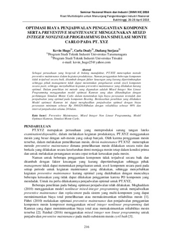 Hugo, Kevin and Doaly, Carla O and Surjasa, Dadang (2018) OPTIMASI BIAYA PENJADWALAN PENGGANTIAN KOMPONEN SERTA PREVENTIVE MAINTENANCE MENGGUNAKAN MIXED INTEGER NONLINEAR PROGRAMMING DAN SIMULASI MONTE CARLO PADA PT. XYZ. In: Prosiding Seminar Nasional Mesin dan Industri (SNMI ) XII 2018. Universitas Tarumanagara, pp. 216-224. ISBN 978-602-71459-9-3