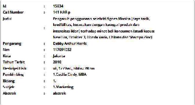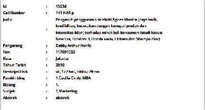 Arthur Harris, Debby (2010) Pengaruh penggunaan selebriti Agnes Monica (daya tarik, kredibilitas, kecocokan dengan kategori produk dan intensitas iklan) terhadap minat beli konsumen (studi kasus: New Era, Provider 3, Honda Vario, Chitato dan Shampo Zinc). Masters thesis, Universitas Tarumanagara.