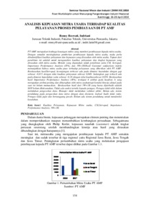 PT AMF merupakan lembaga keuangan mikro yang memberi pembiayaan kepada mitra usaha. Dengan semakin meningkatnya pemberian pembiayaan kepada mitra usaha, maka perlu diindentifikasi kualitas pelayanan dan kepuasan yang dirasakan oleh mitra usaha. Tujuan dari penelitian ini adalah untuk menganalisis kualitas pelayanan dan tingkat kepuasan yang dirasakan oleh mitra usaha. Metode yang digunakan untuk penelitian yaitu CSI, Servqual, Importance Performance Analysis (IPA), dan 5W+1H.Hasil Customer satifactions indeks menunjukkan bahwa mitra usaha puas terhadap pelayanan yang diberikan oleh PT AMF. Berdasarkan hasilServqual, kesenjangan terbesar ada pada dimensi keandalan dengan gap sebesar -0,671 dengan nilai kualitas pelayanan sebesar 0,849. Sedangkan gap terkecil ada pada dimensi kepedulian yaitu sebesar -0,16 dengan nilai kualitassebesar 0,959. Berdasarkan hasil Importance Performance Analisys (IPA), terdapat 4 atribut pada kuadran A yang merupakan atribut penting dan diharapkan oleh mitra usahatetapi kondisi kinerja aktual pada saat ini belum memuaskan. Berdasarkan hasil dari 5W+1H yang harus diperbaiki adalah SOP belum dilaksanakan; Tidak ada sanksi tertulis kepada petugas; Petugas tidak teliti dalam melakukan pengecekan data; Manajer tidak melakukan validasi akhir; Belum ada sistem pendukung pada pengecekan data mitra dengan data disistem; Jadwal Audit tidak rutin; Petugas tidak jujur dan bertanggung jawab; Belum ada sistem pendukung untuk mendeteksi kesalahan.