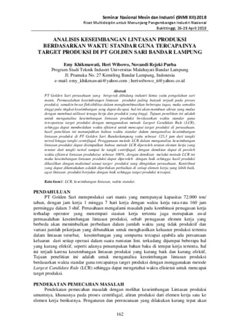 Khikmawati, Emy and Wibowo, Heri and Purba, Novandi Rejeki (2018) Analisis Keseimbangan Lintasan Produksi Berdasarkan Waktu Standar Guna Tercapainya Target Produksi Di PT Golden Sari Bandar Lampung. In: Prosiding Seminar Nasional Mesin dan Industri (SNMI ) XII 2018. Universitas Tarumanagara, pp. 162-168. ISBN 978-602-71459-9-3