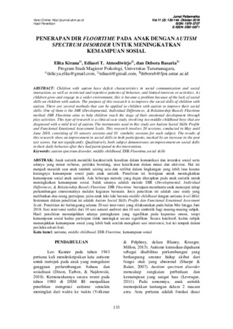 Elita, Kirana and Ediasri T., Atmodiwirjo and Debora, Basaria (2018) PENERAPAN DIR FLOORTIME PADA ANAK DENGAN AUTISM SPECTRUM DISORDER UNTUK MENINGKATKAN KEMAMPUAN SOSIAL. PENERAPAN DIR FLOORTIME PADA ANAK DENGAN AUTISM SPECTRUM DISORDER UNTUK MENINGKATKAN KEMAMPUAN SOSIAL, 11 (2). pp. 133-144. ISSN ISSN: 1979-3707