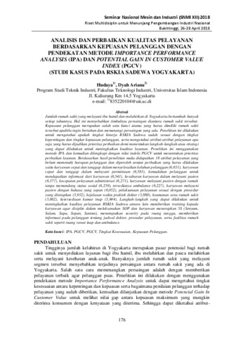 Jumlah rumah sakit yang melayani ibu hamil dan melahirkan di Yogyakarta bertambah banyak setiap tahunnya. Hal ini menyebabkan timbulnya persaingan diantara rumah sakit tersebut. Kepuasan pelanggan merupakan salah satu kunci utama yang harus dimiliki rumah sakit tersebut apabila ingin bertahan dan memenangi persaingan yang ada. Penelitian ini dilakukan untuk mengetahui apakah tingkat kinerja RSKIA Sadewa sudah sesuai dengan tingkat kepentingan dan tingkat kepuasan pelanggan, serta mengetahui atribut-atribut pelayanan apa saja yang harus dijadikan prioritas perbaikan demi menentukan langkah-langkah atau strategi yang dapat dilakukan untuk meningkatkan kualitas layanan. Penelitian ini menggunakan metode IPA dan kemudian dilengkapi dengan nilai indeks PGCV untuk menentukan prioritas perbaikan layanan. Berdasarkan hasil penelitian maka didapatkan 18 atribut pelayanan yang belum memenuhi harapan pelanggan dan diperoleh urutan perbaikan yang harus dilakukan yaitu karyawan cepat dan tanggap dalam menyelesaikan keluhan pelanggan (6,651), karyawan cepat dan tanggap dalam melayani permintaan (6,583), kemudahan pelanggan untuk mendapatkan informasi dari karyawan (6,541), kesabaran karyawan dalam melayani pasien (6,377), kecepatan pelayanan administrasi (6,271), karyawan melayani pasien dengan ramah tanpa memandang status sosial (6,259), tersedianya ambulance (6,227), karyawan melayani pasien dengan bahasa yang sopan (6,052), pelaksanaan pelayanan sesuai dengan prosedur yang ditetapkan (5,932), kejelasan waktu praktek dokter (5,880), keamanan area rumah sakit (5,862), ketersediaan kamar inap (5,844). Langkah-langkah yang dapat dilakukan untuk meningkatkan kualitas pelayanan RSKIA Sadewa antara lain memberikan training kepada karyawan agar disiplin dalam melaksanakan SOP dan karyawan menerapkan 5S (Senyum, Salam, Sapa, Sopan, Santun), menempatkan security pada ruang tunggu, memberikan informasi pada pelanggan tentang jadwal dokter, prosedur pelayanan, serta fasilitas rumah sakit seperti ruang rawat inap dan ambulance.