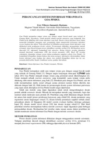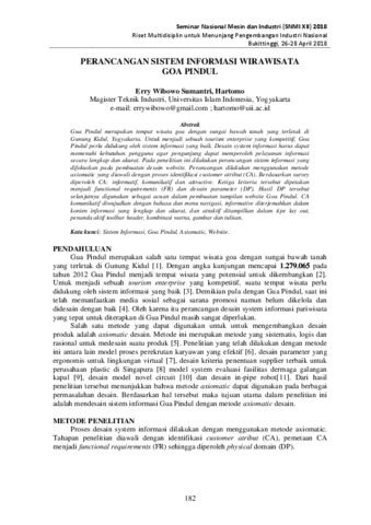 Gua Pindul merupakan tempat wisata goa dengan sungai bawah tanah yang terletak di Gunung Kidul, Yogyakarta. Untuk menjadi sebuah tourism enterprise yang kompetitif, Goa Pindul perlu didukung oleh sistem informasi yang baik. Desain system informasi harus dapat memenuhi kebutuhan pengguna agar pengunjung dapat memperoleh pelayanan informasi secara lengkap dan akurat. Pada penelitian ini dilakukan perancangan sistem informasi yang difokuskan pada pembuatan desain website. Perancangan dilakukan menggunakan metode axiomatic yang diawali dengan proses identifikasi customer atribut (CA). Berdasarkan survey diperoleh CA: informatif, komunikatif dan attractive. Ketiga kriteria tersebut dipetakan menjadi functional requirements (FR) dan desain parameter (DP). Hasil DP tersebut selanjutnya digunakan sebagai acuan dalam pembuatan tampilan website Goa Pindul. CA komunikatif diwujudkan dengan bahasa dan menu navigasi, informative diterjemahkan dalam konten informasi yang lengkap dan akurat, dan atraktif ditampilkan dalam tipe lay out, penanda aktif toolbar header, kombinasi warna, gambar dan tulisan.