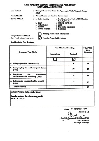 Debora, Basaria Peer Review Hubungan Kecerdasan Emosi dan Psychological Well-Being pada Remaja di Bali. Prosiding Seminar Nasional 2018 Fakultas Psikologi Undip.