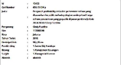 Putrilita, Cindy (2010) Pengaruh profitability ratio dan persentase saham yang ditawarkan ke public terhadap tingkat underpriced harga saham perusahaan yang go public di pasar perdana [eriode 2004-2008. Skripsi thesis, Universitas Tarumanagara.