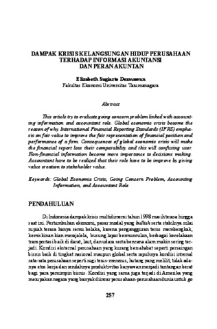 Elizabeth, Elizabeth (2010) Dokumen B.4 Elizabeth Sugiarto Dermawan, SE, M.Si, Ak. Dampak Krisis Kelangsungan Hidup Perusahaan Terhadap Informasi Akuntan dan Peran Akuntan, 10 (3). pp. 257-268. ISSN 1411 - 691X