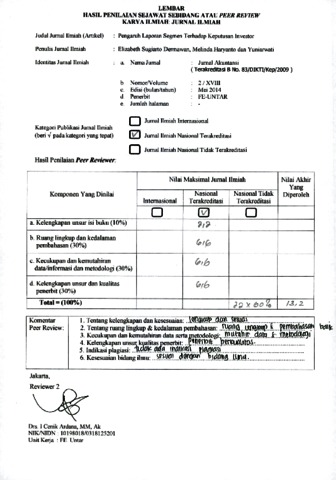 Elizabeth, Elizabeth and Melinda, Melinda and Yuniarwati, review and haryanto, haryanto (2014) Reviewer Jurnal B.11 Elizabeth Sugiarto Dermawan, Melinda Haryanto dan Yuniarwati. Pengaruh Laporan Segmen Terhadap Keputusan Investor, XVIII (2). pp. 216-232. ISSN 1410-3591